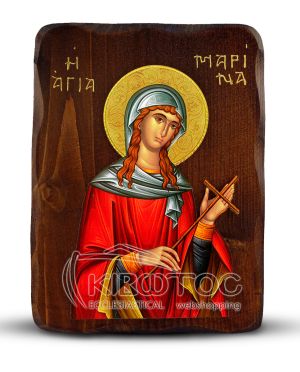 Εκκλησιαστική εικόνα Αγία Μαρίνα φιλοτεχνημένη στα πρότυπα της Βυζαντινής τεχνοτροπίας. Η εικόνα είναι ξύλινη, επίπεδη σε κλασικό εκκλησιαστικό σχέδιο με παραδοσιακό κόκκινο περίγραμμα καδμίου. Είναι ο πιο κλασικός τύπος εικόνας λόγω του διαχρονικού της σχεδιασμού. Η χρήση MDF ξύλου την καθιστά αμετάβλητη στο πέρασμα του χρόνου, καθώς το υλικό του είναι μεγάλης ανθεκτικότητας. Είναι ειδικά επεξεργασμένη και βερνικωμένη για να έχει την μέγιστη αντοχή στον χρόνο και τις φθορές.
