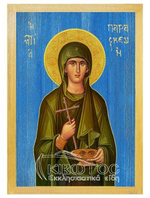 Εκκλησιαστική εικόνα Αγία Παρασκευή φιλοτεχνημένη στα πρότυπα της Βυζαντινής τεχνοτροπίας. Η εικόνα είναι ξύλινη, επίπεδη σε κλασικό εκκλησιαστικό σχέδιο με παραδοσιακό κόκκινο περίγραμμα καδμίου. Είναι ο πιο κλασικός τύπος εικόνας λόγω του διαχρονικού της σχεδιασμού. Η χρήση MDF ξύλου την καθιστά αμετάβλητη στο πέρασμα του χρόνου, καθώς το υλικό του είναι μεγάλης ανθεκτικότητας. Είναι ειδικά επεξεργασμένη και βερνικωμένη για να έχει την μέγιστη αντοχή στον χρόνο και τις φθορές.
