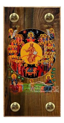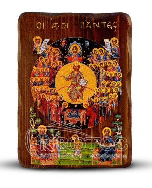 Εκκλησιαστική εικόνα Άγιοι Πάντες φιλοτεχνημένη στα πρότυπα της Βυζαντινής τεχνοτροπίας. Η εικόνα είναι ξύλινη, επίπεδη σε κλασικό εκκλησιαστικό σχέδιο με παραδοσιακό κόκκινο περίγραμμα καδμίου. Είναι ο πιο κλασικός τύπος εικόνας λόγω του διαχρονικού της σχεδιασμού. Η χρήση MDF ξύλου την καθιστά αμετάβλητη στο πέρασμα του χρόνου, καθώς το υλικό του είναι μεγάλης ανθεκτικότητας. Είναι ειδικά επεξεργασμένη και βερνικωμένη για να έχει την μέγιστη αντοχή στον χρόνο και τις φθορές.