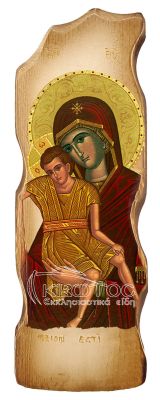 Η Εικόνα Παναγία Άξιον Εστί είναι φιλοτεχνημένη με μεράκι σε φυσικό ξύλο λεύκας. Η τεχνοτροπία της είναι σε λιθογραφία, ενώ το ξύλο έχει λαξευτεί με κυματιστό περίγραμμα που δίνει μια μοντέρνα πνοή στην εικόνα.