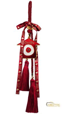 Επιτραπέζιο Γούρι που αποτελείται από λευκό βότσαλο στολισμένο με κόκκινη φουντίτσα και χρυσό σπίτι διακοσμημένο με το Ιησούς Χριστός Νικά.