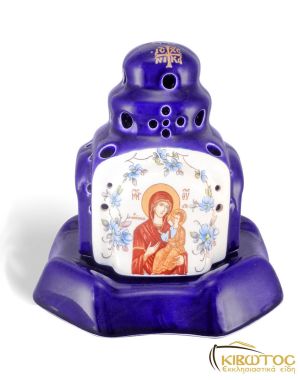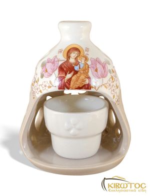 Το Πήλινο Επιτραπέζιο Καντήλι σε σχέδιο Ρόδι έχει μπεζ απόχρωση, είναι αποσπώμενο και παράγεται σε διάσταση 17x16x16cm. Κεντρικά δεσπόζει η παράσταση της Παναγίας που την αγκαλιάζουν πολύχρωμοι ανθοί. Είναι φιλοτεχνημένο εξολοκλήρου στο χέρι σύμφωνα με την Ορθόδοξη Χριστιανική Παράδοση. Κατασκευάζεται στην χώρα μας από έμπειρους Έλληνες τεχνίτες με υλικό τον πηλό και έχει καθαρό βάρος 860gr. Το προϊόν δεν συμπεριλαμβάνει ποτηράκι.